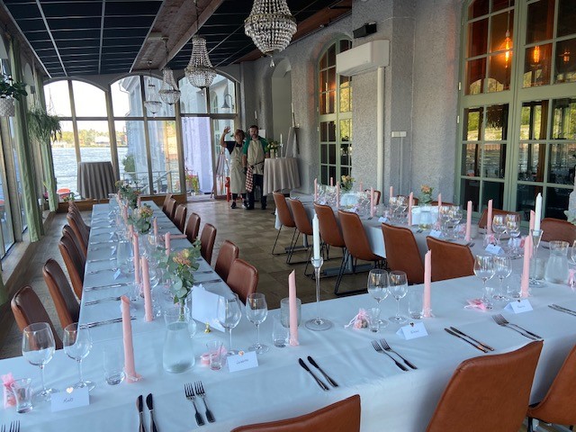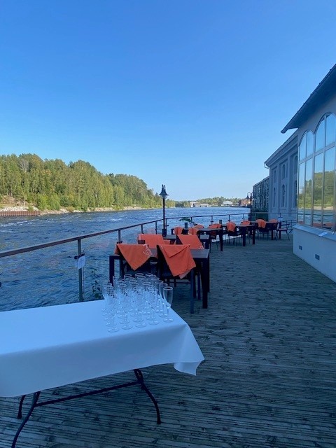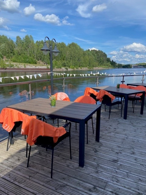 Lokalen rymmer över 120 gäster inomhus och ytterligare 30 på den soliga uteserveringen – med en av stadens bästa vyer över Dalälven.
